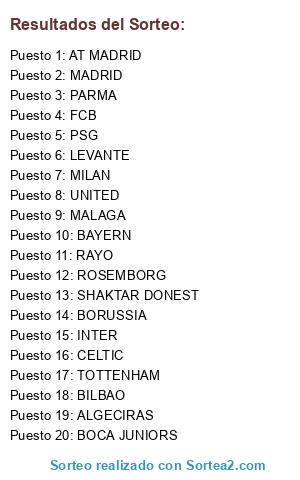 Lista de participantes: INTER, UNITED, BORUSSIA, MADRID, PARMA, CELTIC, BILBAO, MALAGA, MILAN, RAYO, ALGECIRAS, LEVANTE, FCB, BOCA JUNIORS, SHAKTAR DONEST, BAYERN, PSG, TOTTENHAM, AT MADRID, ROSEMBORG.