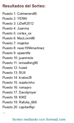 Lista de participantes: LiDeR2012, Davidyinyer, Colmenero85, romapro, kratos28, majeitor, poder__negrito, MacLovin86, Juanma, capitanflipi, ismaelking90, cortex_xx, huied, juanmiole, Rafuka_666, kinglosada, spawntfe, YERAI, RUII, KIKE, naxo1994martinez, isaakcinho.