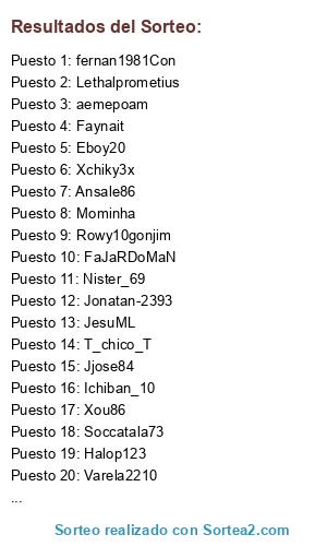 Lista de participantes: Anyelote1985-, JesuML, hEDlondo33, Eboy20, aemepoam, Miguelrp26, Ginman1986, Rowy10gonjim, Jjose84, Jose1979rml, fernan1981Con, Halop123, Xou86, Xchiky3x, Ansale86, FaJaRDoMaN.