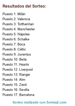 Lista de participantes: Atm, Céltic, Hearts, Barcelona, Zenit, Betis, Manchester, Ranger, Liverpool, Totthenhan, Schalke, Juventus, Nápoles, Sevilla, Valencia, Boca, Milán.