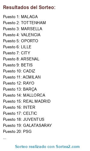 Lista de participantes: BARÇA, REAL MADRID, ATH.MINEIRO, CITY, SEVILLA, PSG, ACMILAN, UNITED, AT.MADRID, ARSENAL, CELTIC, VALENCIA, INTER, JUVENTUS, SHALKE, RAYO, MALAGA, OPORTO, GALATASARAY, BETIS, BILBAO, LILLE, MARSELLA, MALLORCA, TOTTENHAM, CADIZ.