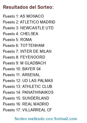 Lista de participantes: REAL MADRID, CHELSEA, NEWCASTLE UTD, ARSENAL, VILLARREAL CF, AS MONACO, FEYENOORD, ATLETICO MADRID, BAYER 04, ROMA, SUNDERLAND, ATHLETIC CLUB, M GLADBACH, PANATHINAIKOS, TOTTENHAM, UD LAS PALMAS, INTER DE MILAN.