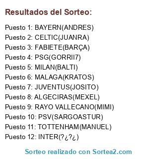 Lista de participantes: MALAGA(KRATOS), PSV(SARGOASTUR), JUVENTUS(JOSITO), BAYERN(ANDRES), PSG(GORRII7), ALGECIRAS(MEXEL), RAYO VALLECANO(MIMI), MILAN(BALTI), CELTIC(JUANRA), TOTTENHAM(MANUEL), INTER(?¿?¿), FABIETE(BARÇA).