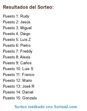 Lista de participantes: Alexis, Carlos, Daniel, Diego, Franco, Freddy, Gonzalo, Jesús, José R, Luis S, Luis Z, Mario, Miguel, Pietro, Rudy.