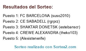 Lista de participantes: CE SABADELL (rgrprz), CREWE ALEXANDRA (theko103), FC BARCELONA (suso2010), SHAKTAR DONETSK (estebanscr), (Alexistenerife).
