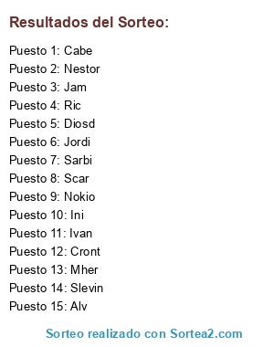 Lista de participantes: Jordi, Scar, Mher, Alv, Ini, Jam, Nokio, Diosd, Ric, Sarbi, Slevin, Ivan, Nestor, Cabe, Cront.