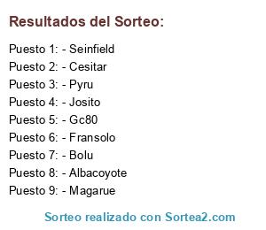 Lista de participantes: - Magarue, - Albacoyote, - Gc80, - Fransolo, - Seinfield, - Bolu, - Josito, - Cesitar, - Pyru.