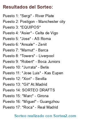 Lista de participantes: SORTEO DRAFTS, *EQUIPOS*, *Asier* - Celta de Vigo, *Roca* - Real Madrid, *Jurrata* - Betis, *Miguel* - Guangzhou, *Marc* - Girona, *Sergi* - River Plate, *Robert* - Boca Juniors, *Jose Luis* - Kas Eupen, *Towers* - Liverpool, *Jose* - AS Roma, Postigon - Manchester city, *Xori* - Sevilla, *Gil* At.Madrid, *Ansale* - Zenit, *Mamut* - Barca.