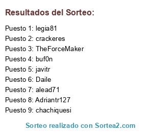 Lista de participantes: Adriantr127, javitr, buf0n, crackeres, TheForceMaker, Daile, alead71, chachiquesi, legia81.