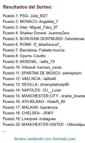 Lista de participantes: CHELSEA - JRIKY, MANCHESTER CITY - kratos_linares, CELTA - Montixx94, SPARTAK DE MOSCU- aemepoam, NAPOLES - DJ__Luian, MANCHESTER UNITED - Ultimatejuanma, ATH.BILBAO - NisteR_69, MILAN - rubenss81, MALAGA- topotencia, BORUSSIA DORTMUND- Calvotainas, ATLETICO DE MADRID- LUISKAYAZA FALTA, PSG- Julio_RD7, VAELNCIA - lalillo46, ROMA- D_labarbacoa7_, ARSENAL - sefis_10, Benfica - guanchu, Villareal- barroso_ceuta, Brighton- Kamikaze, Heerenveen - reymago11, Oporto- Ceutito, boca juniors- honda_ipr_civic, SEVILLA- Jimenystelrooy85, Barcelona- Fabiete-murcia, Inter- Miguel_Fdez_97, Shaktar Donest- JuanmaZero, Real Madrid- empresariales3, MONACO- Angelete_7, Liverpool- malagueo.