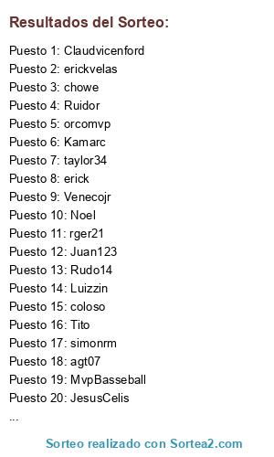 Lista de participantes: agt07, chowe, Claudvicenford, coloso, dayuda, erick, erickvelas, Harold14, JesusCelis, johalvis13, jose11722, Juan123, Kamarc, leorivas, maikelrox, MvpBasseball, Noel, orcomvp, RAYKO, rger21, Rudo14, Ruidor, simonrm, taylor34, team_cartanal, Tito, Venecojr, Yacenis, omardj38, Luizzin.