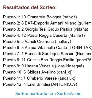 Lista de participantes: 1 Banco di Sardegna Sassari (Number one), 2 Giorgio Tesi Group Pistoia (vidaña), 3 Vanoli Cremona (mallory), 4 Enel Brindisi (ANTONIO39), 5 Acqua Vitasnella Cantú (TOBIN TAX), 6 Sidigas Avellino (dani_cj), 7 Cimberio Varese (andalux), 8 EA7-Emporio Armani Milano (guillem8cbi), 9 Umana Venezia (Jose Nosequé), 10 Granarolo Bologna (solvolf), 11 Grissin Bon Reggio Emilia (pepet76), 12 Pasta Reggia Caserta (Manfe1).