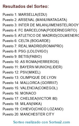 Lista de participantes: BETIS(FABIO), INTER DE MILAN(JIMENISTELROOY), MALLORCA (GORRII7), CELTA (BOGARDE), MILAN(NIKA), MARSELLA(EDU), BAYERN MUNICH(LIDER), CHIEVO(CHICO LOZANO), REAL MADRID(ROMAPRO), PSV(MIKEL), PSG (LOLOVIGO), AS ROMA(HERREROS), FC BARCELONA(PODERNEGRITO), CHELSEA(VICTOR 80), ARSENAL (MANUWATAGATA), VALENCIA(COKEGOL), MANCHESTER CITY, ATLETICO DE MADRID(COLMENERO79), MONACO, OLIMPIQUE DE LYON.