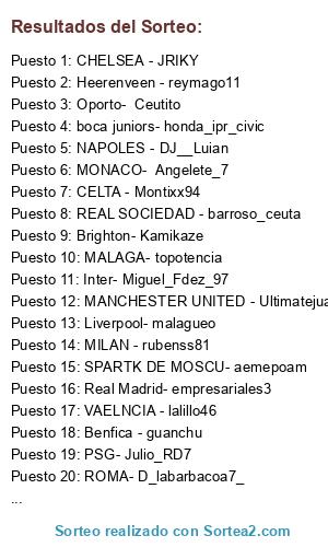 Lista de participantes: CHELSEA - JRIKY, MANCHESTER CITY - kratos_linares, CELTA - Montixx94, SPARTK DE MOSCU- aemepoam, NAPOLES - DJ__Luian, MANCHESTER UNITED - Ultimatejuanma, ATH.BILBAO - NisteR_69, MILAN - rubenss81, MALAGA- topotencia, BORUSSIA DORTMUND- Calvotainas, ATLETICO DE MADRID- LUISKAYAZA, PSG- Julio_RD7, VAELNCIA - lalillo46, ROMA- D_labarbacoa7_, ARSENAL - sefis_10, Benfica - guanchu, REAL SOCIEDAD - barroso_ceuta, Brighton- Kamikaze, Heerenveen - reymago11, Oporto- Ceutito, boca juniors- honda_ipr_civic, SEVILLA- Jimenystelrooy85, Barcelona- Fabiete-murcia, Inter- Miguel_Fdez_97, Shaktar Donest- JuanmaZero, Real Madrid- empresariales3, MONACO- Angelete_7, Liverpool- malagueo.