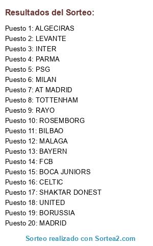 Lista de participantes: INTER, UNITED, BORUSSIA, MADRID, PARMA, CELTIC, BILBAO, MALAGA, MILAN, RAYO, ALGECIRAS, LEVANTE, FCB, BOCA JUNIORS, SHAKTAR DONEST, BAYERN, PSG, TOTTENHAM, AT MADRID, ROSEMBORG.