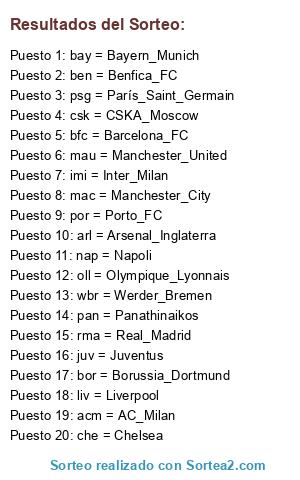 Lista de participantes: acm = AC_Milan, arl = Arsenal_Inglaterra, ben = Benfica_FC, bor = Borussia_Dortmund, che = Chelsea, csk = CSKA_Moscow, juv = Juventus, mau = Manchester_United, nap = Napoli, pan = Panathinaikos, rma = Real_Madrid, wbr = Werder_Bremen, bfc = Barcelona_FC, bay = Bayern_Munich, imi = Inter_Milan, liv = Liverpool, mac = Manchester_City, oll = Olympique_Lyonnais, psg = París_Saint_Germain, por = Porto_FC.