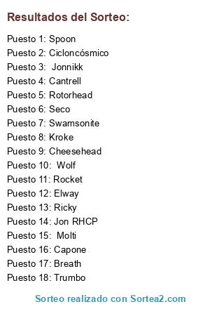 Lista de participantes: Swamsonite, Breath, Jonnikk, Molti, Cicloncósmico, Elway, Spoon, Cantrell, Ricky, Jon RHCP, Wolf, Capone, Cheesehead, Trumbo, Rotorhead, Seco, Kroke, Rocket.