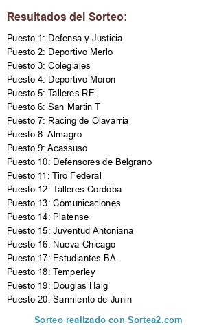 Lista de participantes: Acassuso, Almagro, Colegiales, Comunicaciones, Defensa y Justicia, Defensores de Belgrano, Deportivo Merlo, Deportivo Moron, Douglas Haig, Estudiantes BA, Juventud Antoniana, Nueva Chicago, Platense, Racing de Olavarria, San Martin T, Sarmiento de Junin, Talleres Cordoba, Talleres RE, Temperley, Tiro Federal.