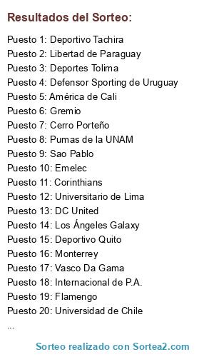 Lista de participantes: Atlético Nacional Medellin, Cerro Porteño, Colo Colo, Corinthians, Cruzeiro, Deportes Tolima, Deportivo Quito, Deportivo Tachira, Flamengo, Internacional de P.A., Liga Deportiva Universitaria de Quito, Monterrey, Nacional de Montevideo, Olimpia, Peñarol, Pumas de la UNAM, Santos FC DT: Zero, Sporting Cristal, Universidad Catolica, Universitario de Lima, Alianza Lima, América de Cali, América de Mexico, Barcelona de Ecuador, Caracas, Cruz Azul, DC United, Defensor Sporting de Uruguay, Emelec, Fluminense, Gremio, Juan Aurich, Libertad de Paraguay, Los Ángeles Galaxy, New York Red Bulls, Once Caldas, Palmeiras, Sao Pablo, Vasco Da Gama, Universidad de Chile.