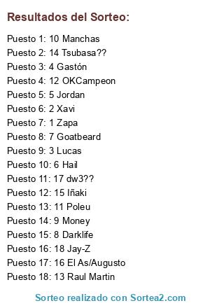 Lista de participantes: 1 Zapa, 2 Xavi, 3 Lucas, 4 Gastón, 5 Jordan, 6 Hail, 7 Goatbeard, 8 Darklife, 9 Money, 10 Manchas, 11 Poleu, 12 OKCampeon, 13 Raul Martin, 14 Tsubasa??, 15 Iñaki, 16 El As/Augusto, 17 dw3??, 18 Jay-Z.
