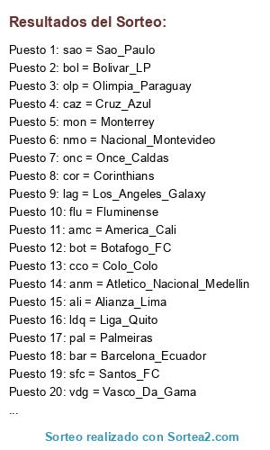 Lista de participantes: anm = Atletico_Nacional_Medellin, cco = Colo_Colo, cor = Corinthians, cru = Cruzeiro, dqu = Deportivo_Quito, dto = Deportes_Tolima, fla = Flamengo, flu = Fluminense, gre = Gremio, int = Inter_PA, mon = Monterrey, nmo = Nacional_Montevideo, olp = Olimpia_Paraguay, pen = Penarol, pum = Pumas_Unam, sfc = Santos_FC, sao = Sao_Paulo, scr = Sporting_Cristal, uli = Universidad_Lima, vdg = Vasco_Da_Gama, ali = Alianza_Lima, amc = America_Cali, ame = America_Mexico, ami = Atletico_Mineiro, bar = Barcelona_Ecuador, bol = Bolivar_LP, bot = Botafogo_FC, cer = Cerro_Porteño, caz = Cruz_Azul, dan = Danubio, dth = Deportivo_Tachira, jau = Juan_Aurich, lag = Los_Angeles_Galaxy, lib = Libertad_Paraguay, ldq = Liga_Quito, nyr = New_York_Red_Bulls, onc = Once_Caldas, pal = Palmeiras, uca = Universidad_Catolica, uch = Universidad_Chile.