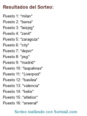 Lista de participantes: *laspalmas*, *arsenal*, *depor*, *valencia*, *madrid*, *Liverpool*, *psg*, *zaragoza*, *betis*, *basilea*, *zenit*, *milan*, *leizpig*, *barsa*, *atletico*, *city*.