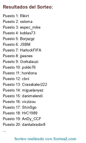Lista de participantes: JSBM, cbrii, AnDy_CCF, andreuinho, mendisala, Gorkalauzi, poldo76, Rikirt, danimelendi, miguelanyez, ShinSgo, HarlockFIFA, danilabrador8, espec_mike, HrC1989, viczizou, Borjszgz, osloma, troncoman, horidona, koblas73, Crasskater222, jjwanes, Eldudu88.