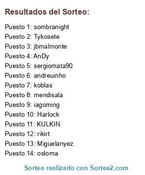 Lista de participantes: koblas, Tykosete, KULKIN, jbmalmonte, Harlock, Miguelanyez, andreuinho, sergiomata90, rikirt, osloma, AnDy, sombranight, iagoming, mendisala.
