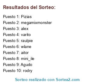 Lista de participantes: Pizias, Agudo, varito, raulpie, alex, aitor, rodry, wlane, megamixmonster, mini_ile.
