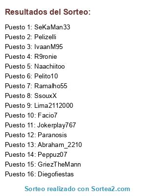 Lista de participantes: Ramalho55, Jokerplay767, Pelizelli, Paranosis, Naachiitoo, Facio7, R9ronie, IvaanM95, Pelito10, Diegofiestas, Lima2112000, SeKaMan33, Abraham_2210, SsouxX, Peppuz07, GriezTheMann.