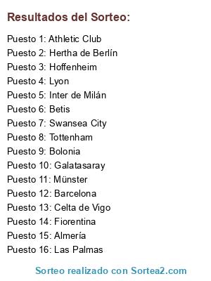 Lista de participantes: Athletic Club, Barcelona, Bolonia, Betis, Almería, Hertha de Berlín, Celta de Vigo, Swansea City, Münster, Inter de Milán, Lyon, Fiorentina, Hoffenheim, Las Palmas, Galatasaray, Tottenham.