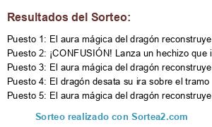 Lista de participantes: El dragón desata su ira sobre el tramo 1 arrasándolo por completo, El dragón desata su ira sobre el tramo 2 arrasándolo por completo, El dragón desata su ira sobre el tramo 3 arrasándolo por completo, El dragón desata su ira sobre el tramo 4 arrasándolo por completo, El dragón desata su ira sobre el tramo 5 arrasándolo por completo, El dragón desata su ira sobre el tramo 6 arrasándolo por completo, El dragón desata su ira sobre el tramo 7 arrasándolo por completo, El dragón desata su ira sobre el tramo 8 arrasándolo por completo, El dragón desata su ira sobre el tramo 9 arrasándolo por completo, El dragón desata su ira sobre el tramo 10 arrasándolo por completo, El aura mágica del dragón reconstruye por completo el tramo 1, El aura mágica del dragón reconstruye por completo el tramo 2, El aura mágica del dragón reconstruye por completo el tramo 3, El aura mágica del dragón reconstruye por completo el tramo 4, El aura mágica del dragón reconstruye por completo el tramo 5, El aura mágica del dragón reconstruye por completo el tramo 6, El aura mágica del dragón reconstruye por completo el tramo 7, El aura mágica del dragón reconstruye por completo el tramo 8, El aura mágica del dragón reconstruye por completo el tramo 9, El aura mágica del dragón reconstruye por completo el tramo 10, ¡Se siente amenazado! En una demostración de fuerza arrasa con los 5 tramos con mayor número de bloques, ¡Ha tenido crías! Las protege fortaleciendo al máximo los 5 tramos con menor número de bloques, ¡CONFUSIÓN! Lanza un hechizo que invierte el juego. Todas las líneas del día contarán para el equipo contrario., ¡HECHIZO DE SUMISIÓN! Todo lo traducido este día por el equipo chino se contabilizará en favor del equipo mongol, ¡HECHIZO DE COBARDÍA! Todo lo traducido este día por el equipo mongol se contabilizará en favor del equipo chino, ¡HECHIZO DE VALENTÍA! Todas las líneas del día traducidas por el equipo mongol tienen el doble de valor (bonus acumulable a cualquier otro que tuvieran), ¡HECHIZO DE INSPIRACIÓN! Todas las líneas del día traducidas por el equipo chino tienen el doble de valor (bonus acumulable a cualquier otro que tuvieran), ¡VAPORES DEL DRAGÓN! El veneno hace que todas las líneas del día traducidas por el equipo chino tengan la mitad de su valor, ¡TEMBLORES SUBTERRÁNEOS! El dragón se mueve bajo tierra haciendo que todas las líneas del día traducidas por el equipo mongol tengan la mitad de su valor.