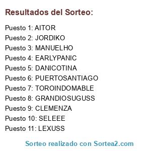 Lista de participantes: AITOR, PUERTOSANTIAGO, DANICOTINA, SELEEE, MANUELHO, CLEMENZA, JORDIKO, LEXUSS, EARLYPANIC, GRANDIOSUGUSS, TOROINDOMABLE.