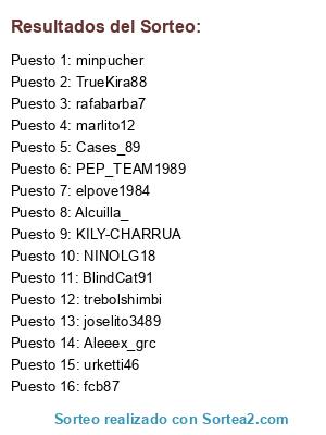 Lista de participantes: Cases_89, Alcuilla_, KILY-CHARRUA, urketti46, Aleeex_grc, elpove1984, minpucher, trebolshimbi, BlindCat91, NINOLG18, marlito12, TrueKira88, joselito3489, rafabarba7, fcb87, PEP_TEAM1989.