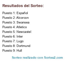 Lista de participantes: Swansea, Alcorcon, Hull, Newcastel, Inter, Atletico, Lugo, Español, Dortmund.