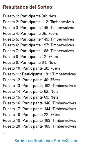 Lista de participantes: Participante 1: 76ers, Participante 2: 76ers, Participante 3: 76ers, Participante 4: 76ers, Participante 5: 76ers, Participante 6: 76ers, Participante 7: 76ers, Participante 8: 76ers, Participante 9: 76ers, Participante 10: 76ers, Participante 11: 76ers, Participante 12: 76ers, Participante 13: 76ers, Participante 14: 76ers, Participante 15: 76ers, Participante 16: 76ers, Participante 17: 76ers, Participante 18: 76ers, Participante 19: 76ers, Participante 20: 76ers, Participante 21: 76ers, Participante 22: 76ers, Participante 23: 76ers, Participante 24: 76ers, Participante 25: 76ers, Participante 26: 76ers, Participante 27: 76ers, Participante 28: 76ers, Participante 29: 76ers, Participante 30: 76ers, Participante 31: 76ers, Participante 32: 76ers, Participante 33: 76ers, Participante 34: 76ers, Participante 35: 76ers, Participante 36: 76ers, Participante 37: 76ers, Participante 38: 76ers, Participante 39: 76ers, Participante 40: 76ers, Participante 41: 76ers, Participante 42: 76ers, Participante 43: 76ers, Participante 44: 76ers, Participante 45: 76ers, Participante 46: 76ers, Participante 47: 76ers, Participante 48: Nets, Participante 49: Nets, Participante 50: Nets, Participante 51: Nets, Participante 52: Nets, Participante 53: Nets, Participante 54: Nets, Participante 55: Nets, Participante 56: Nets, Participante 57: Nets, Participante 58: Nets, Participante 59: Nets, Participante 60: Nets, Participante 61: Nets, Participante 62: Nets, Participante 63: Nets, Participante 64: Nets, Participante 65: Nets, Participante 66: Nets, Participante 67: Nets, Participante 68: Nets, Participante 69: Nets, Participante 70: Nets, Participante 71: Nets, Participante 72: Nets, Participante 73: Nets, Participante 74: Nets, Participante 75: Nets, Participante 76: Nets, Participante 77: Nets, Participante 78: Nets, Participante 79: Nets, Participante 80: Nets, Participante 81: Nets, Participante 82: Nets, Participante 83: Nets, Participante 84: Nets, Participante 85: Nets, Participante 86: Nets, Participante 87: Nets, Participante 88: Nets, Participante 89: Nets, Participante 90: Nets, Participante 91: Nets, Participante 92: Nets, Participante 93: Nets, Participante 94: Nets, Participante 95: Nets, Participante 96: Nets, Participante 97: Nets, Participante 98: Timberwolves, Participante 99: Timberwolves, Participante 100: Timberwolves, Participante 101: Timberwolves, Participante 102: Timberwolves, Participante 103: Timberwolves, Participante 104: Timberwolves, Participante 105: Timberwolves, Participante 106: Timberwolves, Participante 107: Timberwolves, Participante 108: Timberwolves, Participante 109: Timberwolves, Participante 110: Timberwolves, Participante 111: Timberwolves, Participante 112: Timberwolves, Participante 113: Timberwolves, Participante 114: Timberwolves, Participante 115: Timberwolves, Participante 116: Timberwolves, Participante 117: Timberwolves, Participante 118: Timberwolves, Participante 119: Timberwolves, Participante 120: Timberwolves, Participante 121: Timberwolves, Participante 122: Timberwolves, Participante 123: Timberwolves, Participante 124: Timberwolves, Participante 125: Timberwolves, Participante 126: Timberwolves, Participante 127: Timberwolves, Participante 128: Timberwolves, Participante 129: Timberwolves, Participante 130: Timberwolves, Participante 131: Timberwolves, Participante 132: Timberwolves, Participante 133: Timberwolves, Participante 134: Timberwolves, Participante 135: Timberwolves, Participante 136: Timberwolves, Participante 137: Timberwolves, Participante 138: Timberwolves, Participante 139: Timberwolves, Participante 140: Timberwolves, Participante 141: Timberwolves, Participante 142: Timberwolves, Participante 143: Timberwolves, Participante 144: Timberwolves, Participante 145: Timberwolves, Participante 146: Timberwolves, Participante 147: Timberwolves, Participante 148: Timberwolves, Participante 149: Timberwolves, Participante 150: Timberwolves, Participante 151: Timberwolves, Participante 152: Timberwolves, Participante 153: Timberwolves, Participante 154: Timberwolves, Participante 155: Timberwolves, Participante 156: Timberwolves, Participante 157: Timberwolves, Participante 158: Timberwolves, Participante 159: Timberwolves, Participante 160: Timberwolves, Participante 161: Timberwolves, Participante 162: Timberwolves, Participante 163: Timberwolves, Participante 164: Timberwolves, Participante 165: Timberwolves, Participante 166: Timberwolves, Participante 167: Timberwolves, Participante 168: Timberwolves, Participante 169: Timberwolves, Participante 170: Timberwolves, Participante 171: Timberwolves, Participante 172: Timberwolves, Participante 173: Timberwolves, Participante 174: Timberwolves, Participante 175: Timberwolves, Participante 176: Timberwolves, Participante 177: Timberwolves, Participante 178: Timberwolves, Participante 179: Timberwolves, Participante 180: Timberwolves, Participante 181: Timberwolves, Participante 182: Timberwolves, Participante 183: Timberwolves, Participante 184: Timberwolves, Participante 185: Timberwolves, Participante 186: Timberwolves, Participante 187: Timberwolves, Participante 188: Timberwolves, Participante 189: Timberwolves, Participante 190: Timberwolves, Participante 191: Timberwolves, Participante 192: Timberwolves, Participante 193: Timberwolves, Participante 194: Timberwolves, Participante 195: Timberwolves, Participante 196: Timberwolves, Participante 197: Timberwolves, Participante 198: Timberwolves, Participante 199: Timberwolves, Participante 200: Timberwolves, Participante 201: Timberwolves, Participante 202: Timberwolves, Participante 203: Timberwolves, Participante 204: Timberwolves, Participante 205: Timberwolves, Participante 206: Timberwolves, Participante 207: Timberwolves, Participante 208: Timberwolves, Participante 209: Timberwolves, Participante 210: Timberwolves, Participante 211: Timberwolves, Participante 212: Timberwolves, Participante 213: Timberwolve