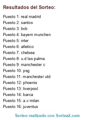 Lista de participantes: u.d las palma, liverpool, barca, phoenix, manchester utd, psg, atletico, inter, bvb, chelsea, manchester c, real madrid, a.c milan, juventus, bayern munchen, santos.