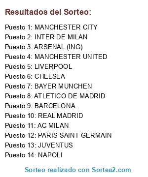 Lista de participantes: ARSENAL (ING), CHELSEA, LIVERPOOL, MANCHESTER CITY, MANCHESTER UNITED, PARIS SAINT GERMAIN, JUVENTUS, INTER DE MILAN, AC MILAN, NAPOLI, ATLETICO DE MADRID, BARCELONA, REAL MADRID, BAYER MUNCHEN.
