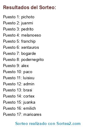 Lista de participantes: admin, bogarde, pedrito, paco, juanmi, franchip, cortex, melanoeso, emilich, alex, marioares, podernegrito, xentauros, luisixu, pichoto, juanka, brasi.