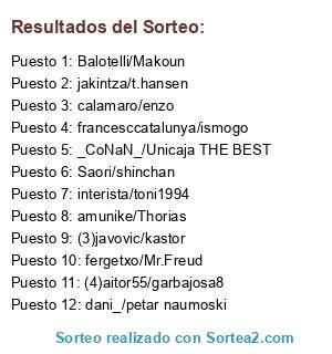Lista de participantes: francesccatalunya/ismogo, _CoNaN_/Unicaja THE BEST, fergetxo/Mr.Freud , Saori/shinchan, (4)aitor55/garbajosa8, interista/toni1994, Balotelli/Makoun, jakintza/t.hansen, (3)javovic/kastor, amunike/Thorias, dani_/petar naumoski, calamaro/enzo.
