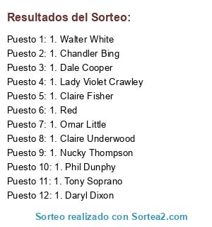 Lista de participantes: 1. Chandler Bing, 1. Lady Violet Crawley, 1. Tony Soprano, 1. Daryl Dixon, 1. Omar Little, 1. Claire Fisher, 1. Nucky Thompson, 1. Walter White, 1. Dale Cooper, 1. Phil Dunphy, 1. Claire Underwood, 1. Red.