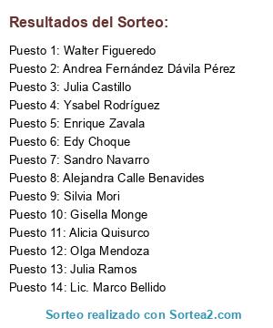 Lista de participantes: Walter Figueredo, Walter Figueredo, Walter Figueredo, Walter Figueredo, Walter Figueredo, Juan Cruz, Juan Cruz, Gisella Monge, Lili Corrales, Lili Corrales, Miguel Reyna, Lic. Marco Bellido, Lic. Marco Bellido, Julissa Santana, Julissa Santana, Julia Ramos, Margarita Ramos, Alan Rodríguez, Sofía Cavero, Claudia Carrillo García, Claudia Carrillo García, Giacomo Verástegui, Christopher Castillo, Dante Mego, Elizabeth Ortiz Roldan, Shirley Alvarez, Shirley Alvarez, Cristina Briceño, Cristina Briceño, Karina Cangahuala, Karina Cangahuala, José Luis Crispin, José Luis Crispin, Noemí Delgadillo, Enrique Hinostroza, Norma Carhuas, Norma Carhuas, Lic. Haydee Cubas, Lic. Haydee Cubas, Sandro Navarro, Silvia Mori, Silvia Mori, Alexander Silva, Alexander Silva, Elva Maza, Elva Maza, Fernando Gomez, Fernando Gomez, Roxana Cepeda, Roxana Cepeda, Edy Choque, Yossira Bendezu, Janisse Unzueta, Juan Unzueta, Mayde Echevarría, Maribel Anchillo, Joao Layseca, Joao Layseca, Magda Bocanegra, Magda Bocanegra, José Ugaz, Yony Nuñez, Yony Nuñez, Claudia Valdivia, Gloria Echevarria, Rosa Rojas, Sandra Eche, Ysabel Rodríguez, Ysabel Rodríguez, Ysabel Rodríguez, Enrique Zavala, Enrique Zavala, Enrique Zavala, Roxana Ruiz, Roxana Ruiz, Eduardo Ugarte, Eduardo Ugarte, Carolina Aguilar, Maryori Revolledo, Jazmin Sanchez, Stella Espinoza, Raúl Quevedo De la Cruz, Mercedes Ramírez, Judith Chávez, Judith Chávez, Alicia Quisurco, Alicia Quisurco, Anggy Machahuay, Anggy Machahuay, Julia Castillo, Nancy Paricahua, Carolina Calle Benavides, Carolina Calle Benavides, Alejandra Calle Benavides, Alejandra Calle Benavides, Alejandra Calle Benavides, Alejandra Calle Benavides, Alejandra Calle Benavides, Alejandra Calle Benavides, Alejandra Calle Benavides, Alejandra Calle Benavides, Maribel Sulla, Roxana Perez, Olga Mendoza, Olga Mendoza, Margarita Mendoza Fernández, Gina Montes, Paola Ramirez Bracamonte, Paola Ramirez Bracamonte, Sofía Grijalba, Sofía Grijalba, Sofía Grijalba, Ayllin Jurado, Ayllin Jurado, Victor Sulla, Jenny Taboada, Kimberly Donayre, Sandra Taboada Mio, Silvia Ronkano, Gabriel Figueroa, Liz Aguilar, Liz Aguilar, Andrés Badajoz, Juana Armas, Dayana Alejandra Espinoza, Mariana Espinoza, Jesús Espinoza, Maria Emilia Espinoza, Rosalbina Montalvo, Esbonemer Clemente, Joseth Chorres, Joseth Chorres, Manuel Roldán, Andrea Fernández Dávila Pérez, Andrea Fernández Dávila Pérez, Miriam Murillo, Alejandro Seminario, Cistina Zavala.