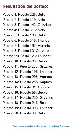 Lista de participantes: Puesto 1: Bulls, Puesto 2: Grizzlies, Puesto 3: Bucks, Puesto 4: Hornets, Puesto 5: Hornets, Puesto 6: Bulls, Puesto 7: Spurs, Puesto 8: Thunder, Puesto 9: Spurs, Puesto 10: Hornets, Puesto 11: Bulls, Puesto 12: Bulls, Puesto 13: Bulls, Puesto 14: Thunder, Puesto 15: Raptors, Puesto 16: Grizzlies, Puesto 17: Hornets, Puesto 18: Hornets, Puesto 19: Bulls, Puesto 20: Spurs, Puesto 21: Thunder, Puesto 22: Grizzlies, Puesto 23: Nets, Puesto 24: Thunder, Puesto 25: Thunder, Puesto 26: Bucks, Puesto 27: Nets, Puesto 28: Bucks, Puesto 29: Bulls, Puesto 30: Hornets, Puesto 31: Thunder, Puesto 32: Raptors, Puesto 33: Grizzlies, Puesto 34: Grizzlies, Puesto 35: Nets, Puesto 36: Thunder, Puesto 37: Hornets, Puesto 38: Bucks, Puesto 39: Thunder, Puesto 40: Thunder, Puesto 41: Raptors, Puesto 42: Thunder, Puesto 43: Bulls, Puesto 44: Bucks, Puesto 45: Hornets, Puesto 46: Bucks, Puesto 47: Nets, Puesto 48: Hornets, Puesto 49: Bulls, Puesto 50: Spurs, Puesto 51: Nets, Puesto 52: Hornets, Puesto 53: Bulls, Puesto 54: Nets, Puesto 55: Bucks, Puesto 56: Thunder, Puesto 57: Bulls, Puesto 58: Nets, Puesto 59: Thunder, Puesto 60: Grizzlies, Puesto 61: Grizzlies, Puesto 62: Bucks, Puesto 63: Grizzlies, Puesto 64: Bucks, Puesto 65: Hornets, Puesto 66: Hornets, Puesto 67: Nets, Puesto 68: Thunder, Puesto 69: Bucks, Puesto 70: Spurs, Puesto 71: Bucks, Puesto 72: Bulls, Puesto 73: Hornets, Puesto 74: Spurs, Puesto 75: Nets, Puesto 76: Raptors, Puesto 77: Raptors, Puesto 78: Thunder, Puesto 79: Hornets, Puesto 80: Nets, Puesto 81: Thunder, Puesto 82: Raptors, Puesto 83: Bucks, Puesto 84: Grizzlies, Puesto 85: Raptors, Puesto 86: Hornets, Puesto 87: Spurs, Puesto 88: Grizzlies, Puesto 89: Thunder, Puesto 90: Bulls, Puesto 91: Hornets, Puesto 92: Hornets, Puesto 93: Raptors, Puesto 94: Raptors, Puesto 95: Thunder, Puesto 96: Nets, Puesto 97: Spurs, Puesto 98: Hornets, Puesto 99: Nets, Puesto 100: Hornets, Puesto 101: Grizzlies, Puesto 102: Hornets, Puesto 103: Raptors, Puesto 104: Thunder, Puesto 105: Grizzlies, Puesto 106: Thunder, Puesto 107: Spurs, Puesto 108: Bulls, Puesto 109: Bulls, Puesto 110: Bulls, Puesto 111: Grizzlies, Puesto 112: Nets, Puesto 113: Hornets, Puesto 114: Raptors, Puesto 115: Nets, Puesto 116: Bulls, Puesto 117: Bucks, Puesto 118: Grizzlies, Puesto 119: Raptors, Puesto 120: Spurs, Puesto 121: Hornets, Puesto 122: Bulls, Puesto 123: Thunder, Puesto 124: Thunder, Puesto 125: Bulls, Puesto 126: Bulls, Puesto 127: Raptors, Puesto 128: Nets, Puesto 129: Bulls, Puesto 130: Raptors, Puesto 131: Bucks, Puesto 132: Grizzlies, Puesto 133: Hornets, Puesto 134: Nets, Puesto 135: Raptors, Puesto 136: Nets, Puesto 137: Raptors, Puesto 138: Bulls, Puesto 139: Raptors, Puesto 140: Raptors, Puesto 141: Bulls, Puesto 142: Grizzlies, Puesto 143: Spurs, Puesto 144: Thunder, Puesto 145: Raptors, Puesto 146: Bulls, Puesto 147: Bucks, Puesto 148: Nets, Puesto 149: Bulls, Puesto 150: Raptors, Puesto 151: Grizzlies, Puesto 152: Thunder, Puesto 153: Thunder, Puesto 154: Bucks, Puesto 155: Grizzlies, Puesto 156: Hornets, Puesto 157: Thunder, Puesto 158: Hornets, Puesto 159: Thunder, Puesto 160: Hornets, Puesto 161: Raptors, Puesto 162: Raptors, Puesto 163: Bulls, Puesto 164: Raptors, Puesto 165: Spurs, Puesto 166: Bulls, Puesto 167: Hornets, Puesto 168: Raptors, Puesto 169: Spurs, Puesto 170: Raptors, Puesto 171: Nets, Puesto 172: Raptors, Puesto 173: Grizzlies, Puesto 174: Nets, Puesto 175: Hornets, Puesto 176: Nets, Puesto 177: Bucks, Puesto 178: Spurs, Puesto 179: Thunder, Puesto 180: Bulls, Puesto 181: Spurs, Puesto 182: Grizzlies, Puesto 183: Grizzlies, Puesto 184: Spurs, Puesto 185: Thunder, Puesto 186: Hornets, Puesto 187: Raptors, Puesto 188: Thunder, Puesto 189: Hornets, Puesto 190: Hornets, Puesto 191: Grizzlies, Puesto 192: Hornets, Puesto 193: Bucks, Puesto 194: Spurs, Puesto 195: Grizzlies, Puesto 196: Thunder, Puesto 197: Grizzlies, Puesto 198: Nets, Puesto 199: Bulls, Puesto 200: Raptors, Puesto 201: Grizzlies, Puesto 202: Nets, Puesto 203: Nets, Puesto 204: Grizzlies, Puesto 205: Bulls, Puesto 206: Grizzlies, Puesto 207: Grizzlies, Puesto 208: Raptors, Puesto 209: Bucks, Puesto 210: Bulls, Puesto 211: Hornets, Puesto 212: Bulls, Puesto 213: Bulls, Puesto 214: Nets, Puesto 215: Grizzlies, Puesto 216: Bulls, Puesto 217: Spurs, Puesto 218: Hornets, Puesto 219: Raptors, Puesto 220: Raptors, Puesto 221: Nets, Puesto 222: Raptors, Puesto 223: Raptors, Puesto 224: Thunder, Puesto 225: Hornets, Puesto 226: Thunder, Puesto 227: Bulls, Puesto 228: Bulls, Puesto 229: Grizzlies, Puesto 230: Grizzlies, Puesto 231: Raptors, Puesto 232: Bulls, Puesto 233: Hornets, Puesto 234: Grizzlies, Puesto 235: Thunder, Puesto 236: Hornets, Puesto 237: Hornets, Puesto 238: Bulls, Puesto 239: Raptors, Puesto 240: Nets, Puesto 241: Nets, Puesto 242: Raptors, Puesto 243: Spurs, Puesto 244: Bulls, Puesto 245: Nets, Puesto 246: Spurs, Puesto 247: Spurs, Puesto 248: Bulls, Puesto 249: Raptors, Puesto 250: Bucks, Puesto 251: Nets, Puesto 252: Bucks, Puesto 253: Nets, Puesto 254: Nets, Puesto 255: Thunder, Puesto 256: Hornets, Puesto 257: Bulls, Puesto 258: Nets, Puesto 259: Spurs, Puesto 260: Grizzlies, Puesto 261: Raptors, Puesto 262: Raptors, Puesto 263: Thunder, Puesto 264: Bulls, Puesto 265: Spurs, Puesto 266: Raptors, Puesto 267: Hornets, Puesto 268: Nets, Puesto 269: Hornets, Puesto 270: Bucks, Puesto 271: Thunder, Puesto 272: Nets, Puesto 273: Bulls, Puesto 274: Bulls, Puesto 275: Nets, Puesto 276: Nets, Puesto 277: Nets, Puesto 278: Hornets, Puesto 279: Hornets, Puesto 280: Spurs, Puesto 281: Grizzlies, Puesto 282: Bucks, Puesto 283: Hornets, Puesto 284: Grizzlies, Puesto 285: Hornets, Puesto 286: Raptors, Puesto 287: Hornets, Puesto 288: Raptors, Puesto 289: Spurs, Puesto 290: Bulls, Puesto 291: Grizzlies, Puesto 292: Raptors, Puesto 293: Raptors, Puesto 294: Bulls, Puesto 295: Nets, Puesto 296: Grizzlies, Puesto 297: Hornets, Puesto 298: Hornets, Puesto 299: Raptors, Puesto 300: Raptors, Puesto 301: Spu