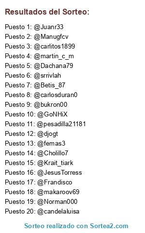 Lista de participantes: @Norman000, @pesadilla21181, @carlosduran0, @Manugfcv, @Frandisco, @djogt, @candelaluisa, @srrivlah, @bukron00, @Krait_tiark, @Betis_87, @martin_c_m, @Dachana79, @JesusTorress, @Juanr33, @makaroov69, @GoNHiX, @carlitos1899, @Cholillo7, @femas3.
