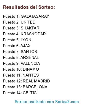 Lista de participantes: LYON, SHAKTAR, BARCELONA, GALATASARAY, KRASNODAR, NANTES, REAL MADRID, DINAMO, ARSENAL, CELTIC, UNITED, VALENCIA, AJAX, SANTOS.