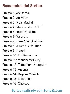 Lista de participantes: Paris Saint Germain, Liverpool, Juventus De Turin, Arsenal, Manchester City, Real Madrid, Chelsea, Napoli, Tottenham Hotspurt, Inter De Milan, F.c Barcelona, Ac Milan, Valencia, As Roma, Manchester United, Bayern Munich.