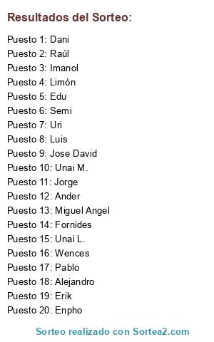 Lista de participantes: Unai M., Alejandro, Erik, Wences, Jorge, Imanol, Enpho, Limón, Ander, Unai L., Jose David, Raúl, Pablo, Uri, Edu, Luis, Miguel Angel, Fornides, Semi, Dani.