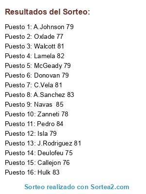 Lista de participantes: Navas 85, Pedro 84, Hulk 83, A.Sanchez 83, Lamela 82, J.Rodriguez 81, C.Vela 81, Walcott 81, Oxlade 77, Deulofeu 75, Callejon 76, Isla 79, Donovan 79, McGeady 79, A.Johnson 79, Zanneti 78.