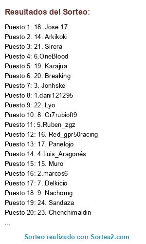 Lista de participantes: 1.dani121295, 2.marcos6, 3. Jonhske, 4.Luis_Aragonés, 5.Ruben_zgz, 6.OneBlood, 7. Delkicio, 8. Cr7rubioft9, 9. Nachomg, 10. Mussambani, 11. Guti14, 12. Pepel17, 13. Perogrullo, 14. Arkikoki, 15. Muro, 16. Red_gpr50racing, 17. Panelojo, 18. Jose.17, 19. Karajua, 20. Breaking, 21. Sirera, 22. Lyo, 23. Chenchimaldin, 24. Sandaza.