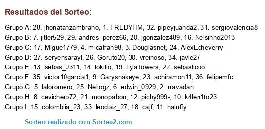 Lista de participantes: 1. FREDYHM, 2. rravadan, 3. Douglasnet, 4. micafran98, 5. laloromero, 6. edwin_0929, 7. jitler529, 8. cevichero72, 9. Garysnakeye, 10. k4len1to23, 11. naluffy, 12. pichy999-, 13. sebas_0311, 14. lokillo, 15. colombiia_23, 16. Nelsinho2013, 17. Migue1779, 18. cajf, 19. LylaTowers, 20. jgonzalez489, 21. monopabon, 22. sebasticoo, 23. achiramon11, 24. AlexEcheverry, 25. Neliogz, 26. Goruto20, 27. seryensarayl, 28. jhonatanzambrano, 29. andres_perez66, 30. vreinoso, 31. sergiovalencia8, 32. pipeyjuanda2, 33. leodiaz_27, 34. javle27, 35. victor10garcia1, 36. felipemfc.